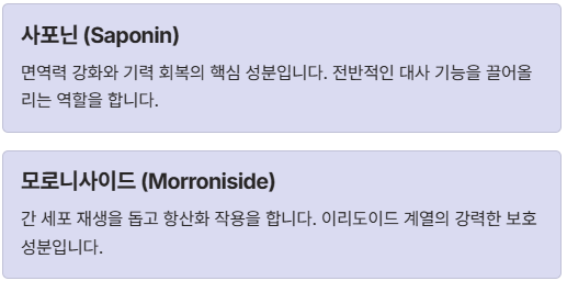 - 사포닌(Saponin): 면역력 강화와 기력 회복의 핵심 성분입니다.