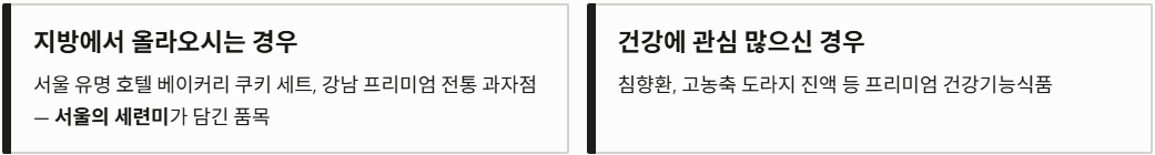- 지방에서 올라오시는 경우: 서울의 유명 호텔 베이커리 쿠키 세트나 강남의 프리미엄 전통 과자점 제품 등 '서울의 세련미'가 담긴 품목이 인기입니다.