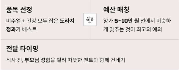 - 10만 원 ~ 20만 원: 약 25%가 선택합니다. 프리미엄 한우 세트나 고급 난(蘭), 소형 건강기능식품 세트가 포함됩니다. 양가 가족이 소규모일 때 정성을 더 강조하기 좋습니다.
