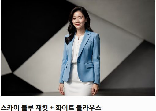 - 스카이 블루 재킷 & 화이트 블라우스/스커트: 밝은 스카이 블루 재킷은 얼굴을 화사하게 밝혀주며, 깨끗한 화이트 블라우스나 스커트와 매치하면 산뜻하면서도 단아한 이미지를 연출할 수 있습니다.