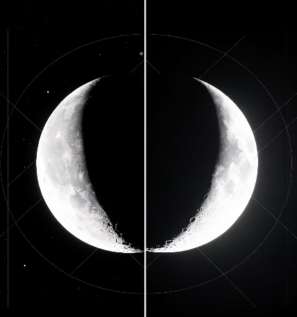 - 하현달 (왼쪽): 달의 왼쪽 반원이 밝게 보입니다. 활의 시위가 아래로 향하는 모양이라 '하현(下弦)'입니다.