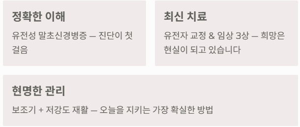 샤르코마리투스병은 분명 견디기 쉽지 않은 여정입니다. 하지만 의학의 발전은 우리가 생각하는 것보다 훨씬 빠릅니다. 정기적인 신경과 검진과 재활을 통해 현재의 기능을 최대한 유지하는 것이 다가올 치료 시대를 준비하는 가장 현명한 방법입니다. 😊