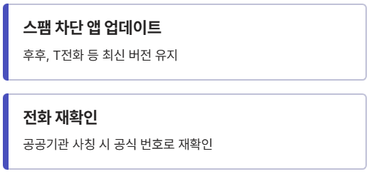 - 공공기관/금융기관 사칭 전화 시 일단 끊고 공식 번호로 재확인