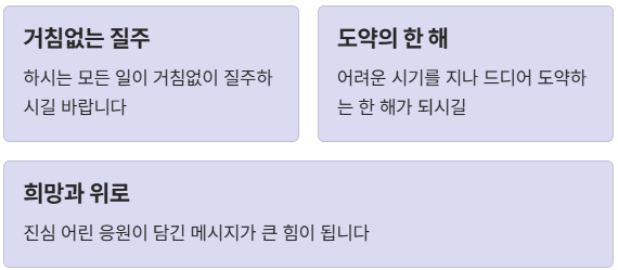 - 짧고 정중한 메시지: "늘 세심하게 이끌어 주셔서 감사합니다. 설 명절만큼은 업무 걱정 잊으시고 가족분들과 편안하고 따뜻한 시간 보내시길 바랍니다. 새해 복 많이 받으십시오."