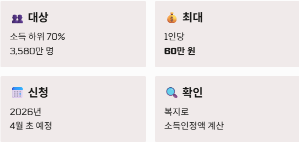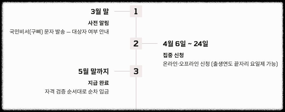 - 3단계 (지급 시작): 신청 후 자격 검증이 완료된 가구부터 순차적으로 입금되며, 늦어도 5월 말까지는 모든 지급을 완료한다는 방침입니다.