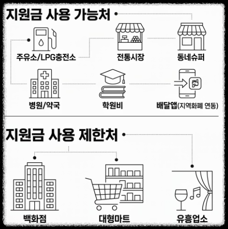 이번 지원금은 '고유가 피해 극복'이라는 목적이 명확합니다. 따라서 전액 현금 지급보다는 소비 진작과 업종 제한이 가미된 형태로 지급될 예정입니다.
