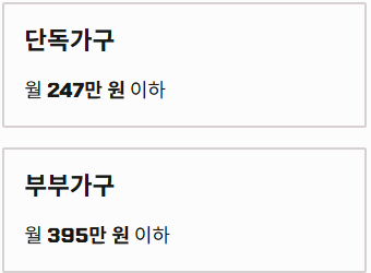- 부부가구 기준: 월 소득인정액이 약 395만 원 이하일 경우 지원 대지에 해당합니다.