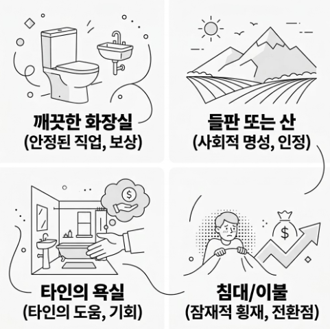 - 남의 집 화장실에서 보는 꿈: 타인의 도움을 받아 일을 성사시키거나, 다른 사람의 재물이나 기회를 자신이 가져오게 됨을 뜻합니다.