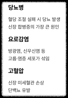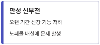 | 만성 신부전 | 오랜 기간 신장 기능이 저하되어 노폐물 배설에 문제가 생긴 상태 |