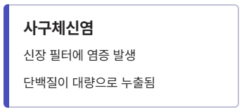 | 사구체신염 | 신장의 필터인 사구체에 염증이 생겨 단백질이 대량으로 새어 나옴 |