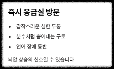 | 뇌졸중 전조 | 심한 두통, 말이 어눌해짐, 팔다리 힘 빠짐과 동반된 구역질 |