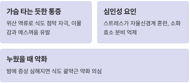- 가슴 타는 듯한 통증: 위산이 역류하면서 식도 점막을 자극해 가슴 쓰림과 함께 목에 뭔가 걸린 듯한 이물감이 메스꺼움을 유발합니다.