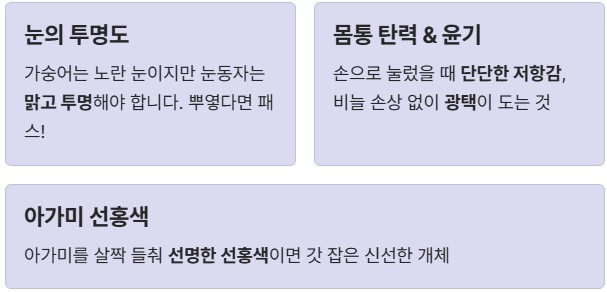 - 몸통의 탄력과 윤기: 손으로 눌러봤을 때 단단한 저항감이 느껴져야 하며, 비늘이 손상되지 않고 전체적으로 광택이 도는 것이 신선합니다.