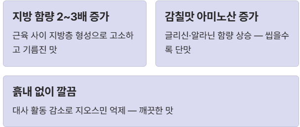 - 치밀한 조직감: 낮은 수온에서 생존하기 위해 근육이 수축되어, 여름철에 비해 훨씬 쫄깃하고 단단한 식감을 제공합니다.
