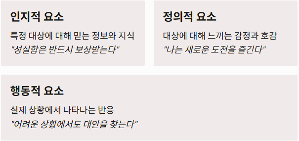 - 정의적 요소: 대상에 대해 느끼는 호감이나 비호감 (예: "나는 새로운 도전을 즐긴다")