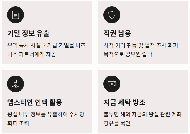 - 기밀 정보 유출: 왕실 무역 특사 재임 당시 입수한 국가급 기밀 정보를 특정 비즈니스 파트너들에게 제공한 혐의입니다.