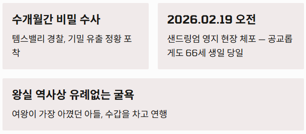 - 엡스타인 인맥 활용: 제프리 엡스타인과 연관된 인물들에게 왕실 내부 정보를 흘려 수사망을 피하도록 도왔다는 의혹을 받고 있습니다.