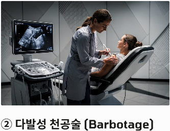 | 초음파 유도하 다발성천공술 | 미세 주삿바늘로 석회 잘게 분쇄 | ESWT와 병행 시 효과 2배 증대 |