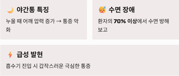 - ✅ 야간통의 특징: 누워 있을 때 어깨 압력이 높아지면서 통증이 심해져 수면 장애를 유발하는 경우가 환자의 70% 이상에서 보고됩니다.