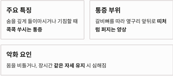 - 늑간신경통: 갈비뼈 사이의 신경에 염증이 생겨 숨을 깊게 들이마시거나 기침할 때 옆구리가 콕콕 쑤십니다.