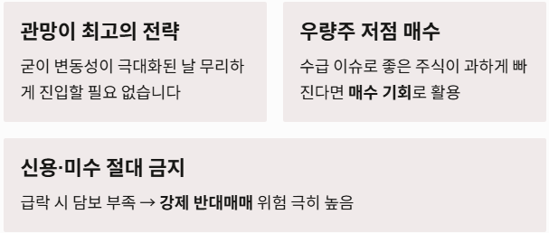 - 신용/미수 금지: 급격한 하락 시 담보 부족으로 인한 반대매매 위험이 큽니다.