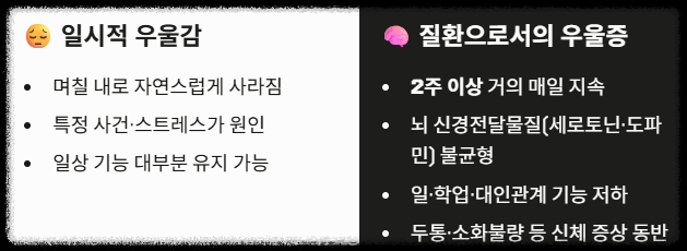 일시적인 '우울감'과 질환으로서의 '우울증'은 엄연히 다릅니다. 우울증은 뇌의 신경전달물질(세로토닌, 도파민 등) 불균형으로 인해 발생하는 생물학적 질환이기 때문입니다.