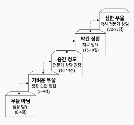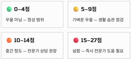 - 0~4점: 우울 아님 / 5~9점: 가벼운 우울 / 10~14점: 중간 정도 / 15~19점: 약간 심함 / 20~27점: 심한 우울