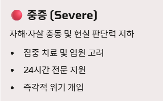 | 중증 (Severe) | 자해/자살 충동 및 현실 판단력 저하 | 집중 치료 및 입원 고려 |