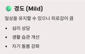 | 경도 (Mild) | 일상을 유지할 수 있으나 피로감이 큼 | 심리 상담 및 생활 습관 개선 |