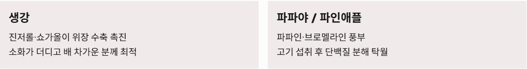 - 파파야/파인애플: 단백질 분해 효소인 파파인과 브로멜라인이 풍부하여 고기 섭취 후 소화 불량을 예방하는 데 탁월합니다.