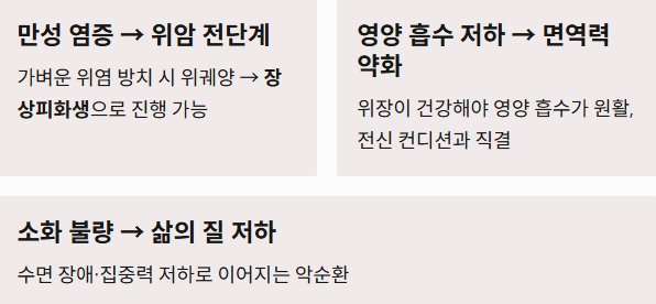 - 만성 염증의 위험성: 위 점막에 생긴 가벼운 위염을 방치하면 위궤양으로 진행되며, 장기간 지속될 경우 위암의 전단계인 장상피화생으로 발전할 수 있습니다.