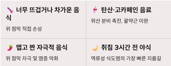 - 위장을 파괴하는 최악의 음식: 너무 뜨겁거나 차가운 음식, 탄산음료, 고카페인 음료, 맵고 짠 자극적인 음식, 그리고 취침 3시간 전의 야식입니다. 특히 야식은 하부식도괄약근을 느슨하게 만들어 역류성 식도염의 지름길이 됩니다.