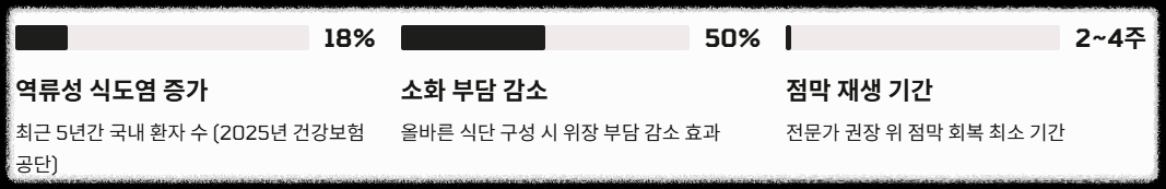 - 역류성 식도염 확산: 2025년 국민건강공단 통계에 따르면, 국내 역류성 식도염 환자는 최근 5년간 약 18% 증가했습니다. 이는 서구화된 식단과 야식 문화가 주원인입니다.