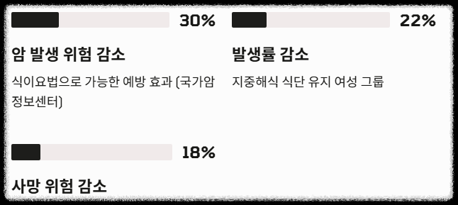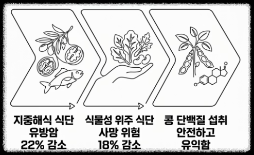 2025-2026년 발표된 최신 연구 데이터에 따르면, 지중해식 식단(올리브유, 견과류, 생선 중심)을 유지한 여성 그룹은 그렇지 않은 그룹에 비해 유방암 발생률이 약 22% 낮게 나타났습니다.