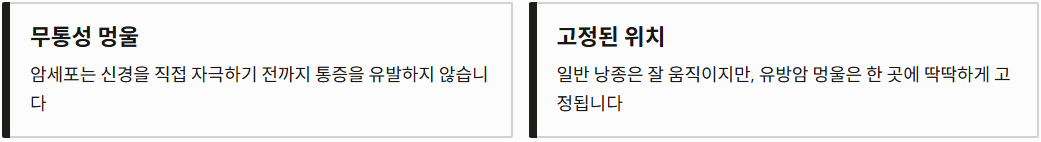 - 무통성 멍울: 암세포는 주변 조직을 침범하며 자라지만, 신경을 직접 자극하기 전까지는 통증을 유발하지 않는 특성이 있습니다.