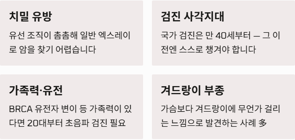 - 치밀 유방: 젊은 여성은 유선 조직이 촘촘한 '치밀 유방'인 경우가 많아 일반 엑스레이 검사로는 암을 찾기 어렵습니다.
