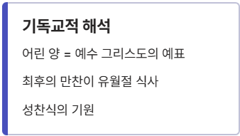 - 기독교적 해석: 개신교와 가톨릭에서는 유월절의 어린 양을 인류의 죄를 대신해 희생된 예수 그리스도의 예표로 봅니다. 최후의 만찬이 바로 유월절 식사였기에, 성찬식의 기원으로 연결 짓기도 합니다.