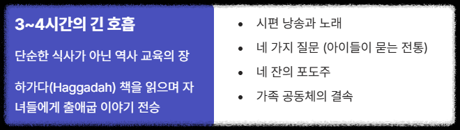 - 세데르 식사의 긴 호흡: 실제 참여자들의 후기에 따르면, 유월절 정식 식사인 세데르는 밤늦게까지 3~4시간 이상 이어집니다. 시편을 노래하고 질문을 주고받는 분위기가 매우 활기차다고 합니다.