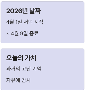 - 2026년 시작 일시: 양력 기준으로 2026년 4월 1일 수요일 저녁(해 질 녘)부터 공식적인 절기가 시작됩니다.