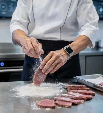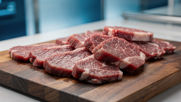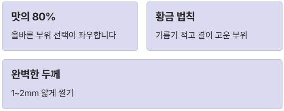 - 손질 팁: 냉동된 고기를 살짝 해동했을 때 칼질이 가장 잘 됩니다. 집에서 직접 손질한다면 결을 잘 살피는 것이 핵심입니다.