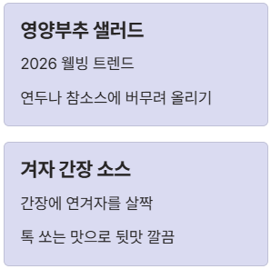 - 영양부추 샐러드: 2026년 웰빙 트렌드! 영양부추를 연두나 참소스에 살짝 버무려 육전 위에 고명처럼 올려 드세요. 손님 초대 요리로 비주얼까지 챙길 수 있습니다.