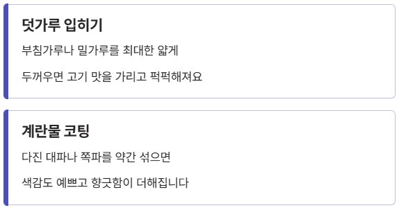 - 계란물 코팅: 계란물에 다진 대파나 쪽파를 약간 섞으면 색감도 예쁘고 향긋함이 더해집니다.