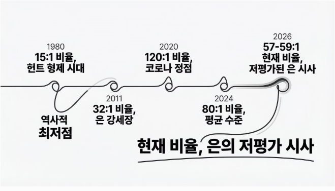 2026년 현재 이 비율은 약 57~59:1 수준으로, 장기 평균치 내에 안정적으로 자리 잡고 있습니다. 하지만 과거 인플레이션 시기나 버블 형성 시기에 이 비율이 15~30:1까지 좁혀졌던 사례를 고려하면, 현재의 수치는 은의 추가적인 가치 재평가 가능성을 충분히 열어두고 있다고 볼 수 있습니다.
