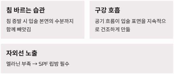 - 구강 호흡: 코가 막혀 입으로 숨을 쉬면 공기 흐름이 입술을 계속 건조하게 만듭니다.