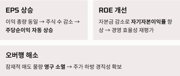 - 수급 불균형 해소: 시장에 유통될 수 있는 잠재적 매도 물량(오버행)이 영구적으로 사라지므로 주가 하방 경직성이 확보됩니다.