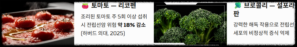 - 브로콜리(설포라판): 강력한 해독 작용을 하는 설포라판이 풍부하여 전립선 세포의 비정상적인 증식을 억제합니다.