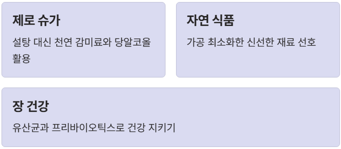 - 제로 슈가(Zero Sugar): 설탕 대신 천연 감미료나 당알코올을 활용한 제품이 대세입니다.