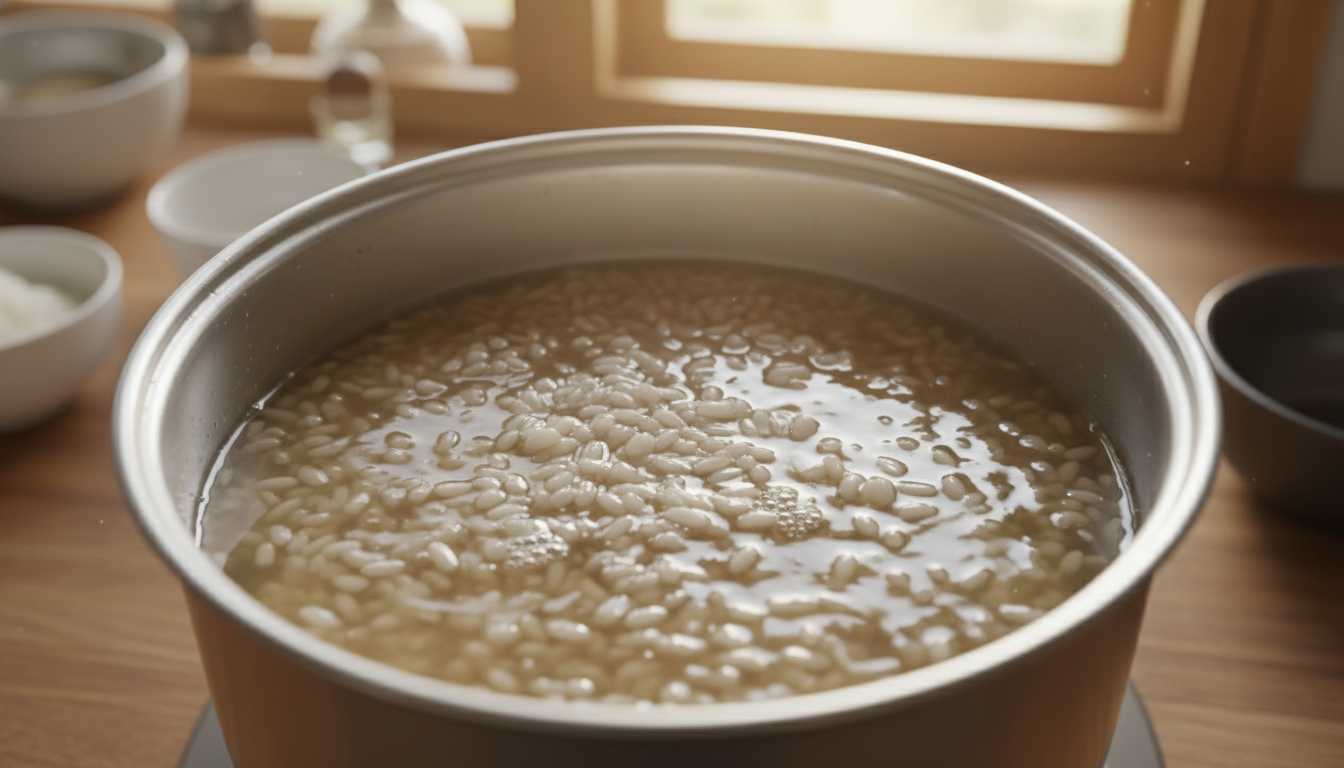 - 끓이기:밥알이 충분히 뜨면 밥알만 건져 찬물에 헹궈 따로 보관합니다. 엿기름 물은 큰 냄비에 붓고 약불에서 끓입니다. 이때, 단맛이 부족하다고 느껴진다면 소량의 스테비아나 에리스리톨, 혹은 배즙을 넣어 조절해 줍니다. 끓기 시작하면 약불로 줄여 10분 정도 더 끓인 후 불을 끕니다.