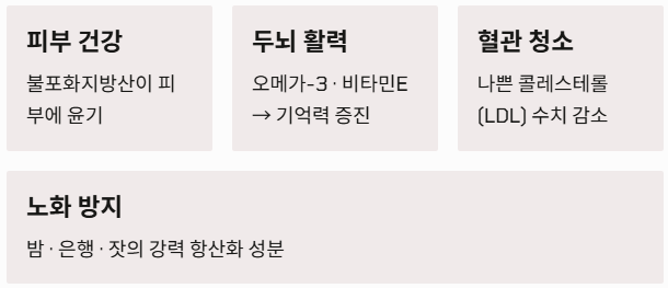 - 두뇌 활력과 혈관 청소: 호두와 땅콩에 풍부한 오메가-3와 비타민 E는 뇌 신경세포를 보호하고 기억력을 증진시키는 데 탁월합니다. 또한 나쁜 콜레스테롤(LDL)을 수치를 낮춰 혈액순환을 원활하게 하므로 혈관 건강 관리에도 큰 도움이 됩니다.