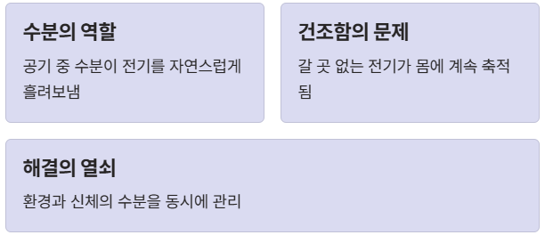 정전기를 없애는 가장 근본적인 방법은 주변 환경과 내 몸의 '수분'을 유지하는 것입니다. 물기가 있는 곳에는 정전기가 머물지 못한다는 사실을 꼭 기억하세요.